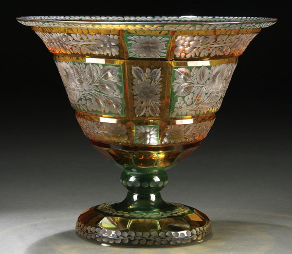 A VERY FINE AUSTRIAN THREE COLOR CUT GLASS COMPOTE, CIRCA 1900.Of inverted bell shape, finely copper wheel cut with foliate decorated panels on an emerald green and amber flashed ground. Diameter 8.25 inches (21 cm), height 7 inches (17.5 cm).