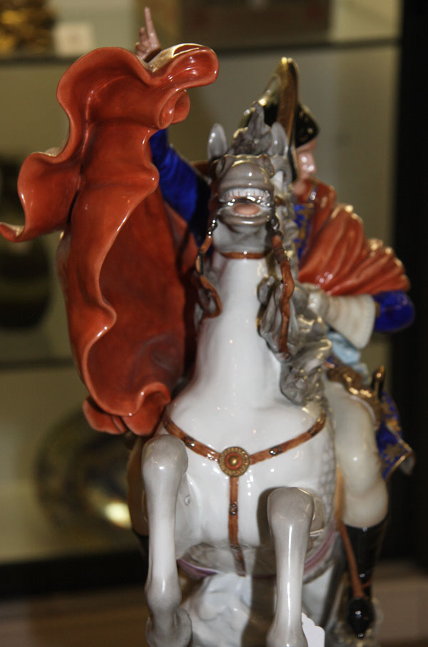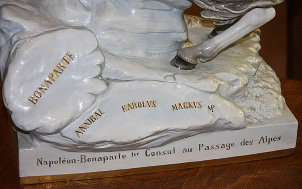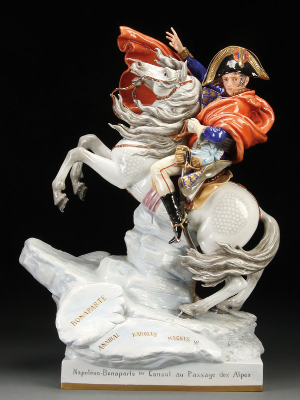 A LARGE AND IMPRESSIVE SCHEIB-ALSBACH PORCELAIN FIGURE OF NAPOLEON "PASSAGE DES ALPES", LAST QUARTER 20TH CENTURY. Depicting the fully sculpted figure of Napoleon mounted on a horse as seen traveling through the Alps. The verso with blue underglaze backstamp and "Made in GDR". Height 25 inches (64 cm).