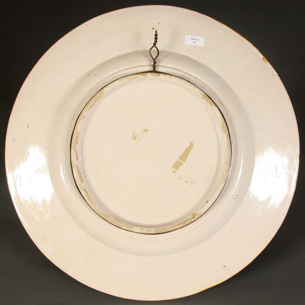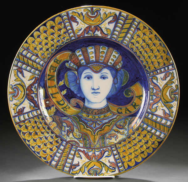 IN THE MANNER OF PAOLO RUBBOLI, AN ITALIAN FAIENCE POTTERY CHARGER, EARLY 20TH CENTURY.With a Renaissance-style portrait of a woman titled "Benilde Cara". Unmarked. Diameter 15.25 inches (38.5 cm).