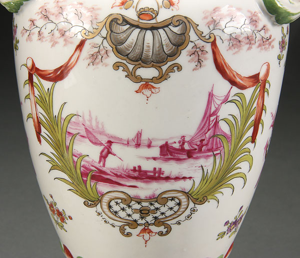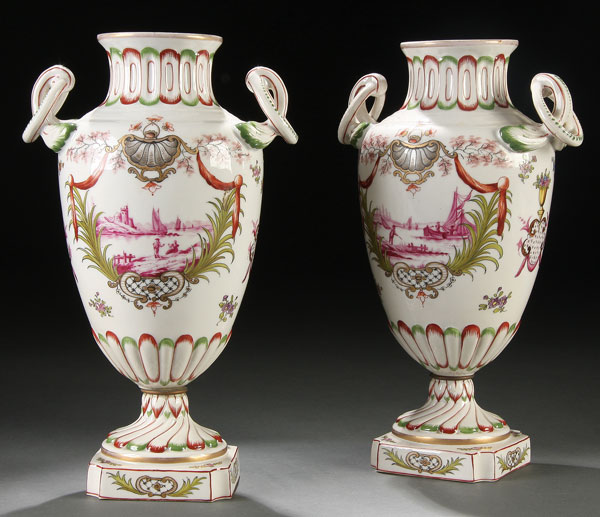 A VERY FINE PAIR OF FRENCH SEVRES-STYLE PORCELAIN URNS, 19TH CENTURY.Of baluster form with applied, scrolled ring handles and bolted spiral flute pedestal, each finely painted. With a Grisaille coastal scene within a foliate cartouche below a gilt scallop shell with prunus branches. Indistinctly signed "Secaup?" Height 11 inches (28 cm).