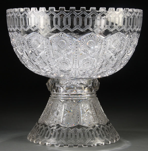 A LARGE AND IMPRESSIVE "ALHAMBRA" PATTERN CUT GLASS PUNCH BOWL AND PEDESTAL, AMERICAN BRILLIANT PERIOD, EARLY 20TH CENTURY.Probably by Meridan cut glass company. Comprising a 14.25 inch (36 cm) diameter bowl, finely cut with hob star panels below a repeating hexagonal band raised on a matching flared foot pedestal. Total height 13.5 inches (34.5 cm). Minor loss on base.