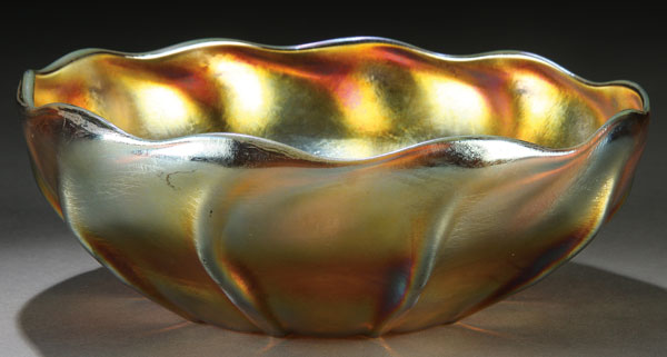 A GOOD L.C. TIFFANY GOLD FAVRILE GLASS LOW BOWL, CIRCA 1900.With ribbed swirled panels and scalloped rim. Inscribed on base L.C.T. Favrille. Diameter 8.25 inches (21 cm).