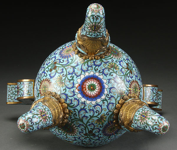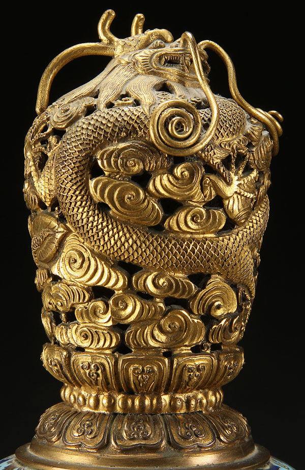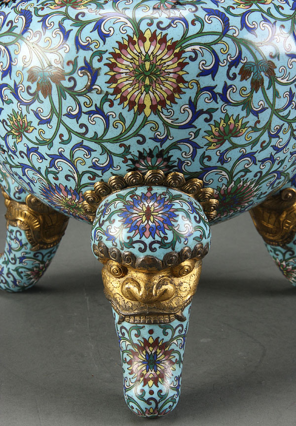 A VERY FINE CHINESE GILT BRONZE AND CLOISONNE TRIPOD CENSER, QIANLONG PERIOD, 18TH CENTURY.Of compressed globular form, finely enameled with an overall design of interlocking lotus raised on three legs with sculpted and parcel gilt mythical beast masks below a reticulated lid with cloisonné enameled ruyi head forms, gilt bats and stylized clouds surmounted by a reticulated finial with coiled dragon. Height 18.25 inches (46.5 cm).