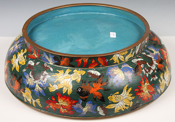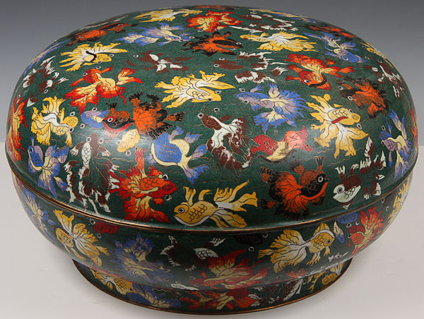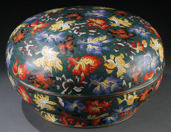 A LARGE AND IMPRESSIVE CHINESE CLOISONNE ENAMELED AND GILT BRONZE COVERED BOX, 20TH CENTURY.Of circular pillow form, finely enameled with "100 koi" in polychrome shaded enamel on emerald green. Diameter 15 inches (38 cm), height 8.5 inches (21.5 cm).