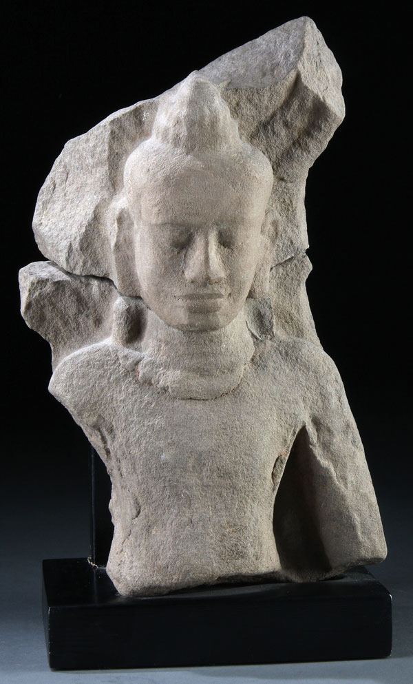 A CAMBODIAN CARVED SANDSTONE PANEL OF A DEITY, KHMER OR KOH-KER 10TH-13TH CENTURY,Depicting the carved bust and partial torso on panel figure of a deity carved in a light brown sandstone and displayed on a later wood bracketed base. Height of stone 13.5 inches (34 cm). Total height 15.25 inches (39 cm).