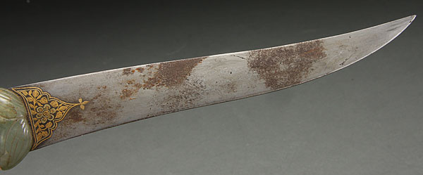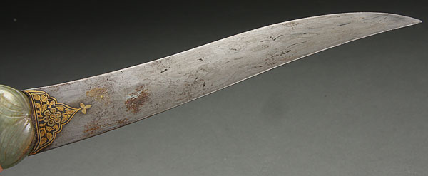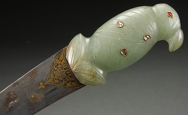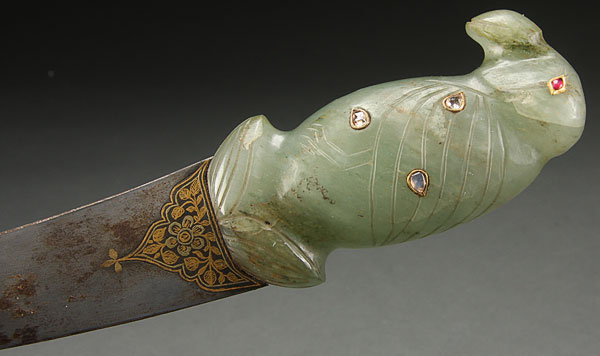 A FINE CHINESE MUGHAL STYLE CARVED CELADON JADE GEM STONE MOUNTED AND GOLD INLAID DAGGER, LATE QING/EARLY REPUBLIC PERIOD.The figural bird form hilt carved in pale celadon jade set with white sapphire cabochons and ruby gemstone eyes in gold mounts extending from a Damascus steel blade decorated with inlaid gold scrolled foliates and contained in a velvet covered wood sheath. The dagger length 12 inches (30 cm).