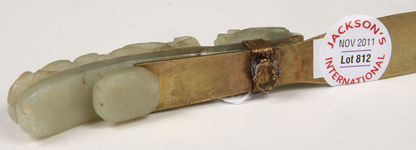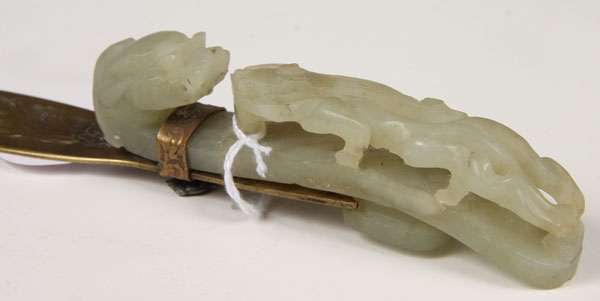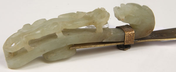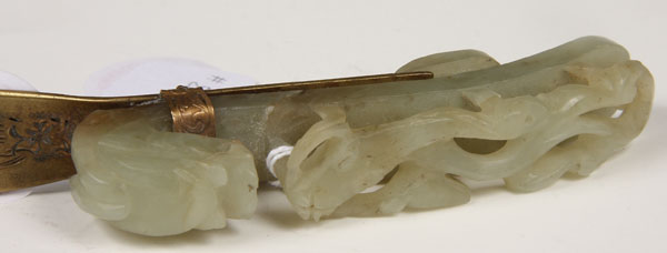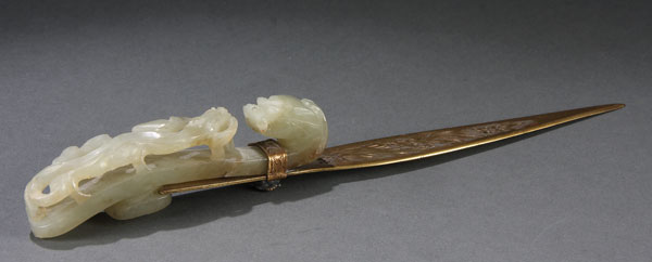 A GOOD CHINESE CARVED WHITE JADE BELT HOOK AND GILT BRONZE LETTER KNIFE, LATE QING/EARLY REPUBLIC PERIOD.Of scrolled elongated form in an even toned pale celadon colored white jade carved with a dragons head and open work dragonet later mounted as a handle to a gilt bronze letter knife with engraved floral decoration. The jade length 3.75 inches (9.5 cm), overall 8.75 inches (22 cm).