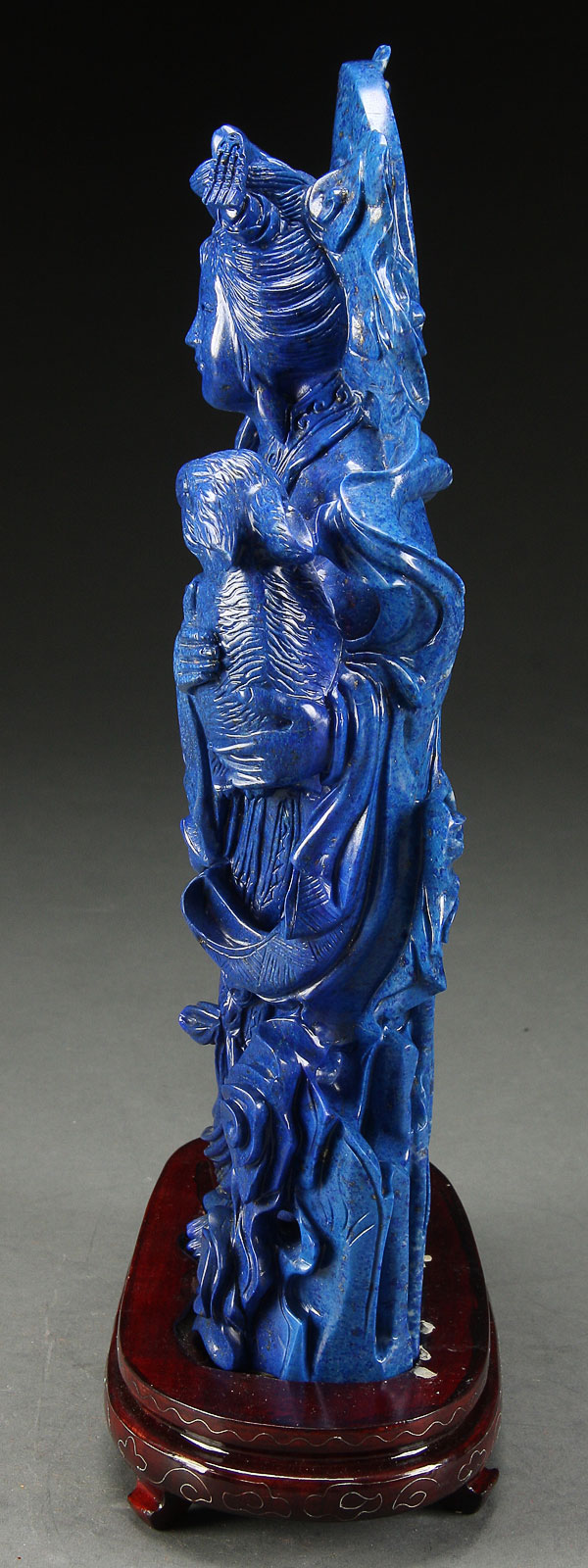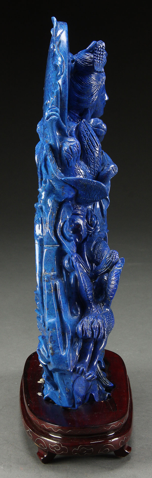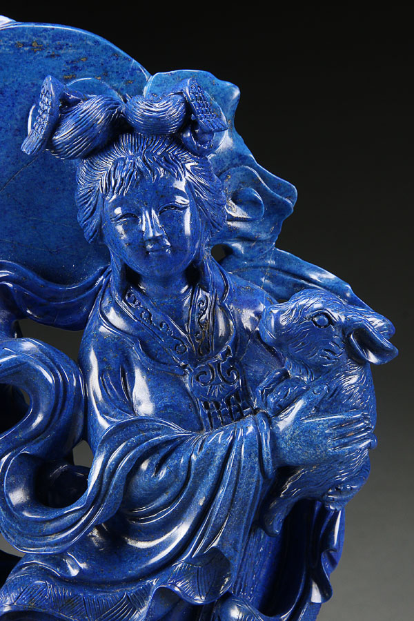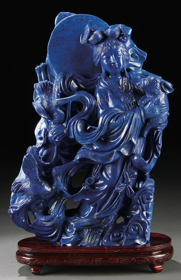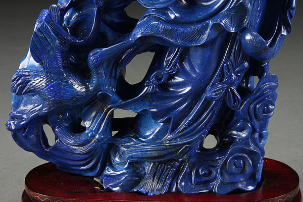 A LARGE AND IMPRESSIVE CHINESE CARVED BLUE LAPIS LAZULI KWAN-YIN FIGURAL GROUP, 20TH CENTURY. The vivid deep cobalt blue lapis boulder with turquois highlights and gold flecks throughout; finely carved with an open work scene of the goddess Kwan Yin depicted standing and holding a rabbit surrounded by flowing gowns, birds, foliage and stylized cloud forms. Height 11.75 inches (30 cm) excluding base, weight 8 lbs, 8 ounces (3,862 g).