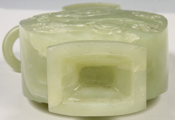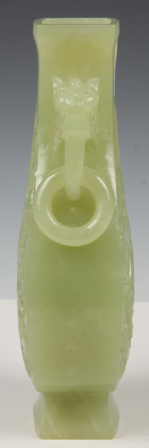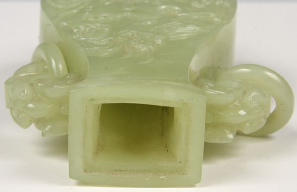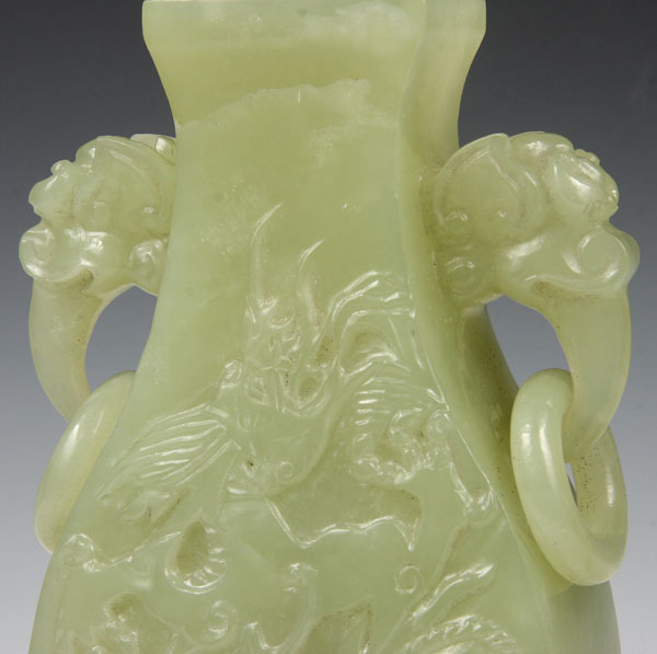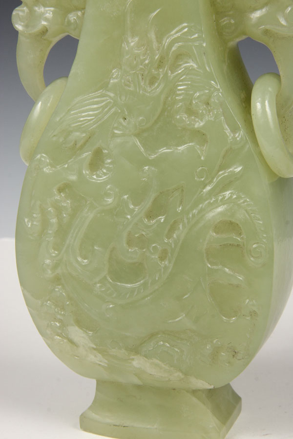 A CHINESE CARVED SERPENTINE COVERED HANDLED VASE, 20TH CENTURY.Of flattened baluster form carved in deep relief with a design of dragons below mythical beast head handles suspending loose rings covered with a carved figural lid terminating in a temple lion finial. Height 9.25 inches (23.5 cm).