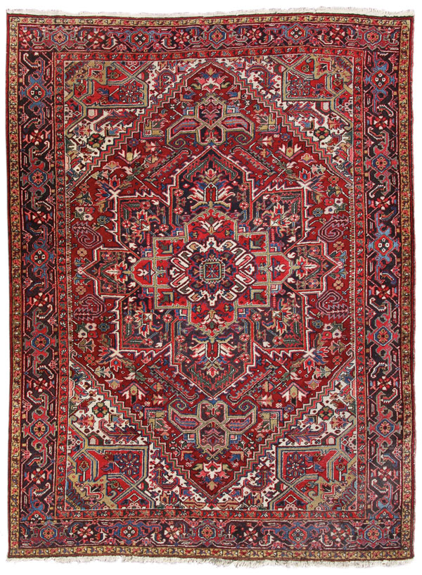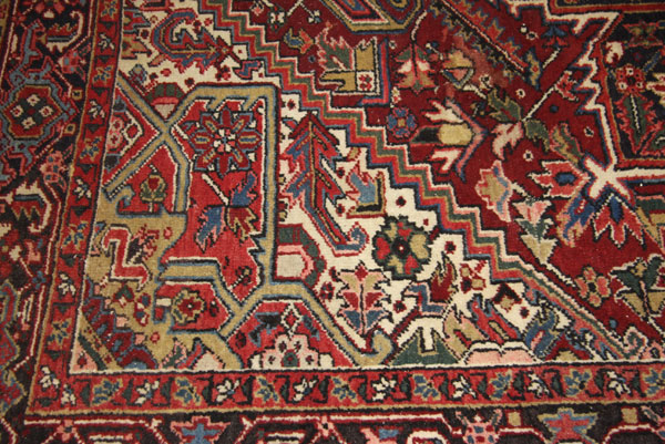 A GOOD HAND WOVEN PERSIAN "HERIZ" ROOM SIZED ORIENTAL CARPET, CIRCA 1930'S-40'S.Finely woven with a large central medallion in geometric stylized florals designs. 97 inches x 125 inches (246 x 317.5 cm).