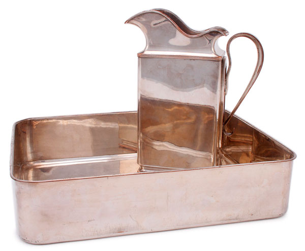 AN IMPERIAL RUSSIAN SILVERED PARTIAL WASH SET, PERIOD OF NICHOLAS I. Comprising a deep silver plated copper basin with rounded corners and a large water pitcher with removable handle. The pitcher with Cyrillic maker’s mark PETS beneath the Imperial Warrant, bearing the cipher of Nicholas I. Height of pitcher 9.25 inches (23.5 cm).