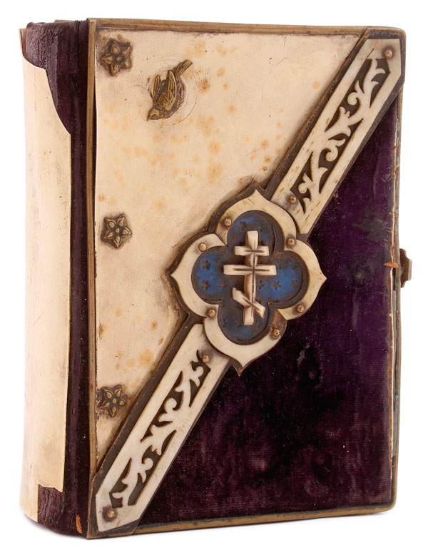 A RUSSIAN PRAYER BOOK WITH CARVED BONE, CELLULOID AND VELVET COVER, CIRCA 1893. Length 6 inches (15 cm).