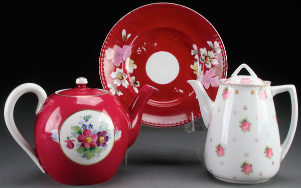 A GROUP OF RUSSIAN PORCELAIN. Comprising an early Soviet period teapot, a Kuznetsov marked plate, and a Gardner teapot with floral decorations. Greatest size 8.5 inches (21.5 cm).