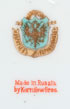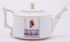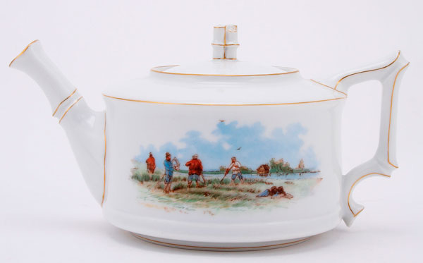 A KORNILOV BROTHERS PORCELAIN TEAPOT. The spout, handle and finial in stylized bamboo motif, and the side with harvest scene and a bust profile of a peasant woman wearing a Kokoshnik on an embroidered ruzhnik, and with gilt banding. Underside with Kornilov Brothers mark beneath the Imperial Warrant and number 79. Length 8.25 inches (21 cm).