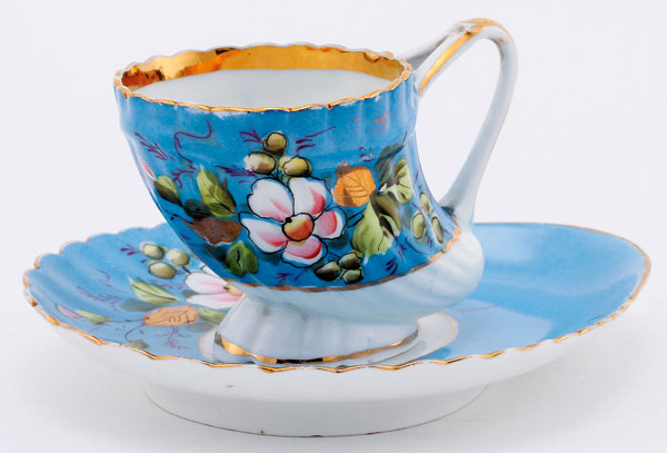 A KUZNETSOV PORCELAIN NOVELTY SHELL-FORM CABINET CUP AND SAUCER, MOSCOW CIRCA 1890. The shell form saucer on slightly raised foot and the cornucopia form cup overall decorated with floral sprigs on a light blue ground with gilt edging. Underside of both with blue Kuznetsov mark beneath the Imperial Warrant. Greatest length 6 inches (15 cm).