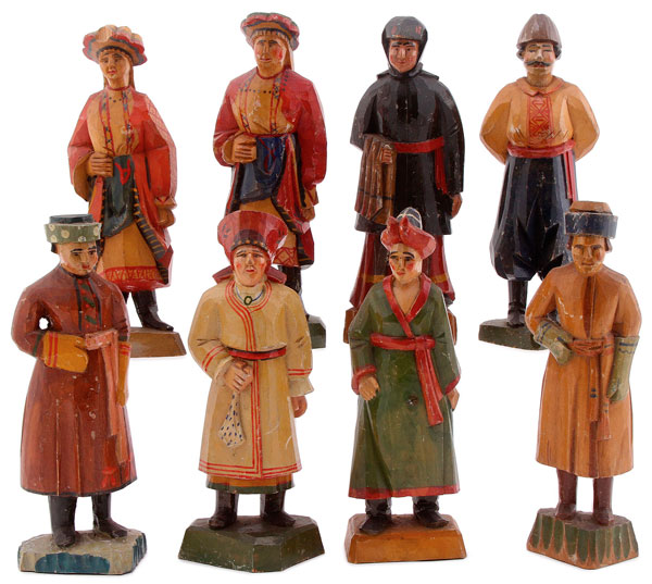 The tradition of carved wooden toys produced in the settlement around the Holy Trinity-St. Sergius Lavra (Sergiev Posad) northeast of Moscow dates back to the 18th century and reached its peak of notoriety at the end of the 19th and beginning of the 20th century. In the early Soviet period, the time from which the examples in the offered lot were produced, very little changed from those produced in the late Imperial period. Like toys of every generation, because they were played with and in particular if the materials were less resilient to the vagaries of time, few good examples of toys from this period exist.