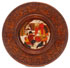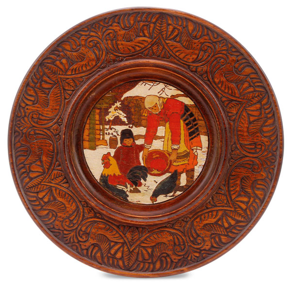 A FINE RUSSIAN KUSTAR CARVED PYROGRAVURE AND POLYCHROME WOOD CHARGER, SERGIEV POSAD, CIRCA 1915. The cavetto with a poker-work (pyrogravure) painted scene of a peasant mother and child feeding chickens in a winter villagescape. The wide raised borders carved with repeating pattern of birds amongst foliage. Diameter 12.2 inches (31 cm).