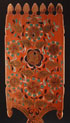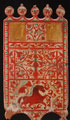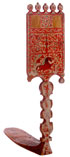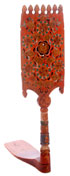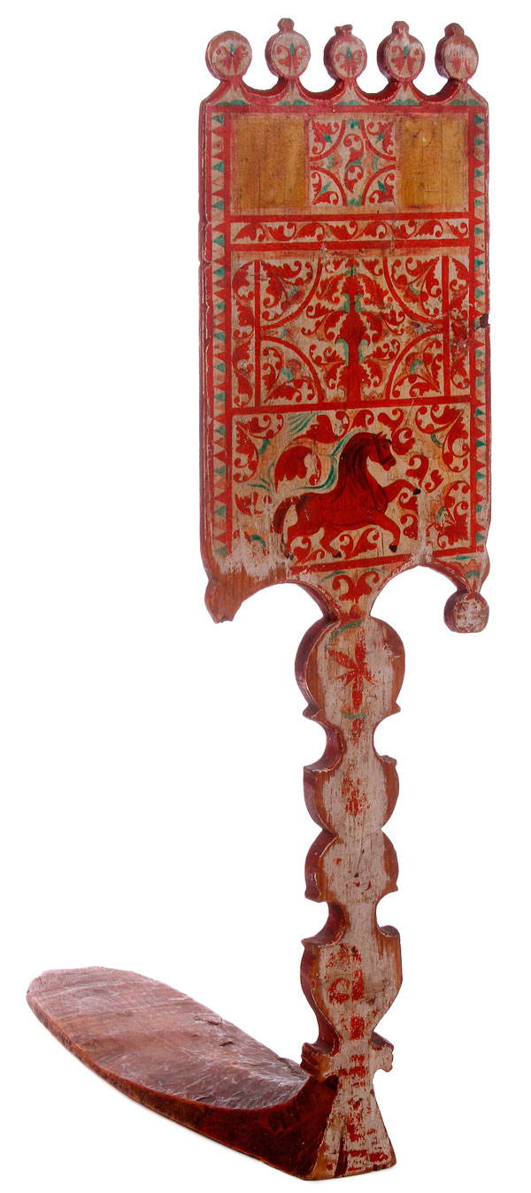 A PAIR OF RUSSIAN KUSTAR CARVED AND POLYCHROME DISTAFFS, CIRCA 1875-1915, PROBABLY ARKHANGELSK PROVINCE. The first with flat cut staff and the large panel painted with galloping horse and overall with scrolling foliage. The second with lathe-turned staff overall painted with flowers and dated 1913. Heights: 34.25 inches (87 cm) and 36 inches (91.5 cm).