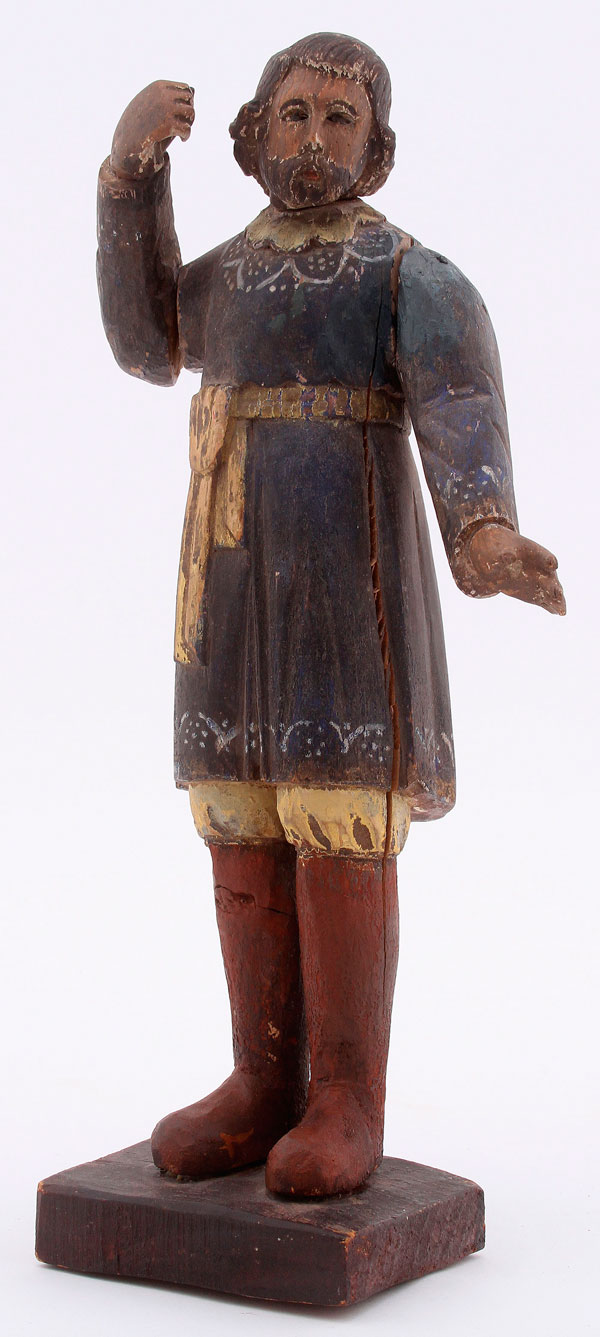 A RUSSIAN OR LITHUANIAN CARVED AND POLYCHROME WOOD FIGURE OF A PEASANT, 19TH CENTURY. Carved in full round and mounted on a square wooden base. Height 14.25 inches (36.2 cm).