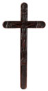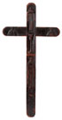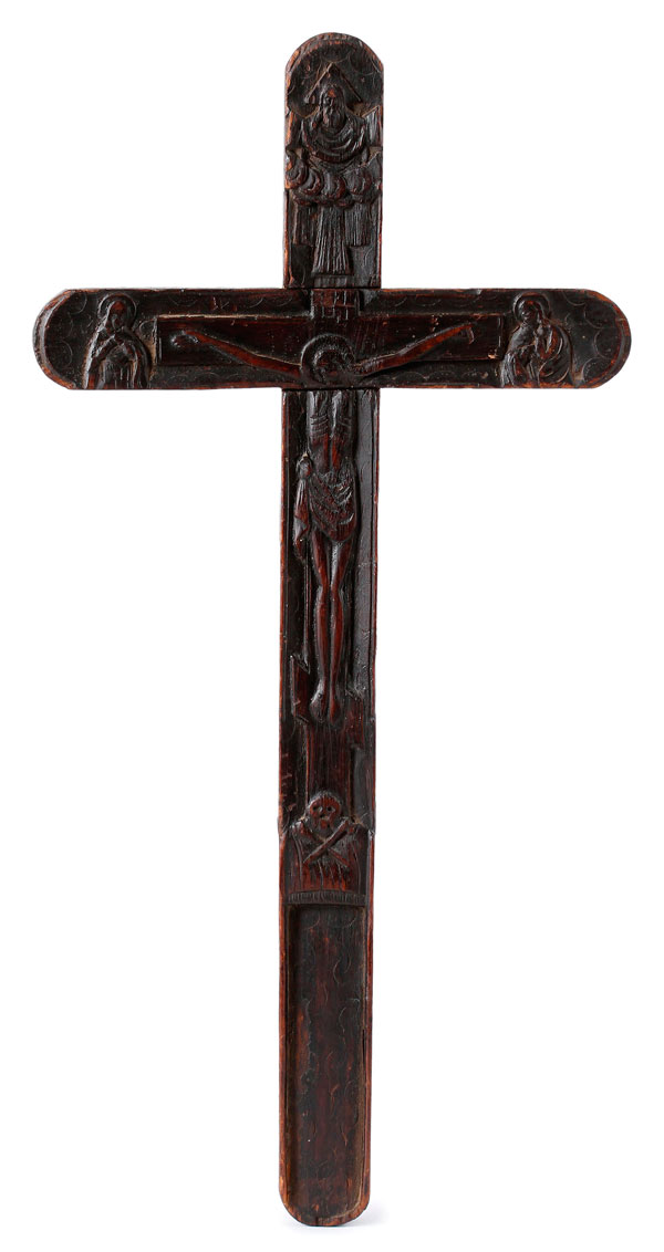 A RUSSIAN CARVED WOOD ALTAR CROSS, 18TH CENTURY, PROBABLY THE TRINITY LAVRA OF SAINT SERGIUS WORKSHOP. The front of the two piece constructed wood cross carved in relief with the crucified Christ. The terminating ends of the cross beam carved with the Mother of God and the Apostle St. John and at top God the Father. The verso carved with a chalice beneath the All-Seeing Eye of God and below a full length image of a monastic saint, probably St. Sergius and the terminating ends of cross beam carved with bust images of other Monastic Saints. Length 13.6 inches (34.5 cm).