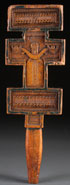 The Hutsuls are an ethno-cultural group who for centuries has inhabited the Carpathian Mountains, mainly in Ukraine and in the northern extremity of Romania. Hutsuls regard themselves as being part of the broader Rusyn ethnic minority and/or as Ukrainian highlanders. A large part of Carpathian Rus' is wooded. The chief occupation of the Hutsuls, besides sheep-breeding, is based on primarily on forestry, subsequently for centuries the axe has been the emblem of the Hutsuls and the subject of many folk songs. Wood carving has been a time honored trade of the Hutsuls. From ornately and ornamentally carved everyday objects to their distinct wooden churches, icons and religious items such as the offered lot.