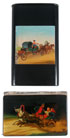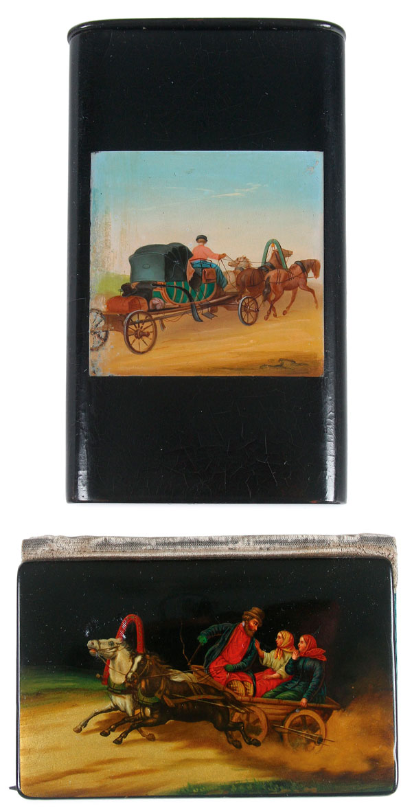 A RUSSIAN LACQUER CIGAR CASE AND NOTEBOOK/WALLET, LUKUTIN, 19TH CENTURY. The cigar case painted with a troika carriage scene. The wallet finely painted with a summer troika scene on lustre ground. Both with Lukutin marks. Largest height 5.5 inches (14 cm).