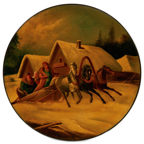 A FINE RUSSIAN LACQUER PLATE, VISHNIAKOV, 19TH CENTURY. Painted with a winter troika scene on lustre ground. Verso with Vishniakov mark, contained in the original issuance box exhibiting Vishniakov label. Diameter 7.2 inches (18.3 cm).