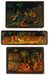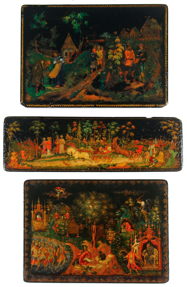 THREE VERY FINE RUSSIAN LACQUER BOXES, PALEKH, 1932 AND 1940. The first depicting a country scene of travelers, signed and dated Palekh, 1940, numbered 3809, with indistinct artist signature. The second a glove box, finely painted with an animated rural country scene, signed and dated Palekh, 1932, with indistinct artist signature. The third decorated with a Pushkin fairytale scene, signed and dated Palekh, 1932 and artist signed "D. Butor?". Largest length 9.5 inches (24.2 cm).