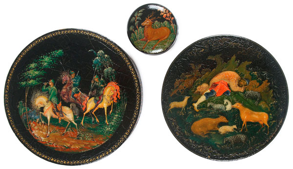 THREE RUSSIAN LACQUER BOXES, PALEKH, 1920S-30S. The first decorated with an early Soviet scene of horse mounted Red Army soldiers, signed and dated Palekh, 1932, artist signed "A. Bakanov". The second painted with a deer, signed and dated Palekh, 1925 and artist signed "G.Bakanov". The third depicting a sleeping shepherd with flock, signed and dated Palekh, 1930, with indistinct artist signature. The largest diameter 4 inches (10 cm).