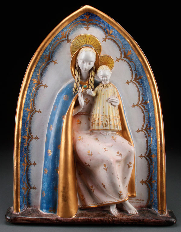 A LOVELY PATTARINO GLAZED CERAMIC PLAQUE OF THE MADONNA AND CHILD, CIRCA 1955. Set within a gilt bordered Gothic arch, the seated Madonna with golden locks, cradling the infant Christ who stands on her lap and delivers a blessing. Signed in gilt "Prof. E. Pattarino, Firenze- Italy". Height 19 inches (48.3 cm).