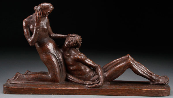 A POIGNANT CARVED OAK FIGURAL GROUPING OF THE PIETA BY GERMAN ARTIST RICHARD BAUROTH (B. 1884- ), CIRCA 1920. Carved in full round, rising from a rectangular integral base, the crucified Christ leaning against his mother who cradles his lifeless head in her hands. Signed on base "R. Bauroth". Length 22 inches (56 cm), height 12 inches (30.5 cm).