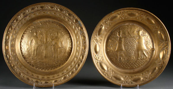 A PAIR OF GERMAN BRASS REPOUSSÉ ALMS DISHES, 17TH/18TH CENTURY. One depicting the fall of man (Adam and Eve in the Garden of Eden), the other with a scene of Joshua and Caleb carrying grapes. Diameter 16.75 inches (42.5 cm) and 15.5 inches (39.5 cm).