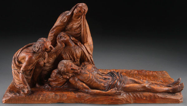 A LARGE AND IMPRESSIVE CARVED FIGURAL GROUPING OF THE LAMENTATION, ITALIAN, CIRCA 1890. Carved in full round, resting on an integral base, the Virgin Mary cradles her crucified son as the Apostle John and others look on. Signed on base "Prof. Bartoli". Length 24 inches (61 cm), height 13.25 inches (34 cm).