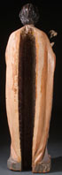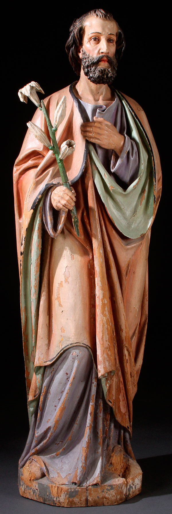 A THREE QUARTERS LIFE SIZE CARVED AND POLYCHROME WOOD FIGURE OF SAINT JOSEPH, PROBABLY GERMAN, FIRST HALF 19TH CENTURY. Carved in full round, of good proportions, deep folds and intricately carved beard. Hollow back and with losses. Height 61.5 inches (156 cm).