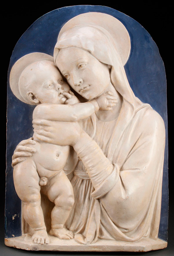 A MADONNA AND CHILD GLAZED HIGH RELIEF PLAQUE, 19TH CENTURY. Cast polychrome and glazed plaque sculpted in high relief in the Renaissance style. 23.5 inches x 15.25 inches (59.7 x 38.8 cm).