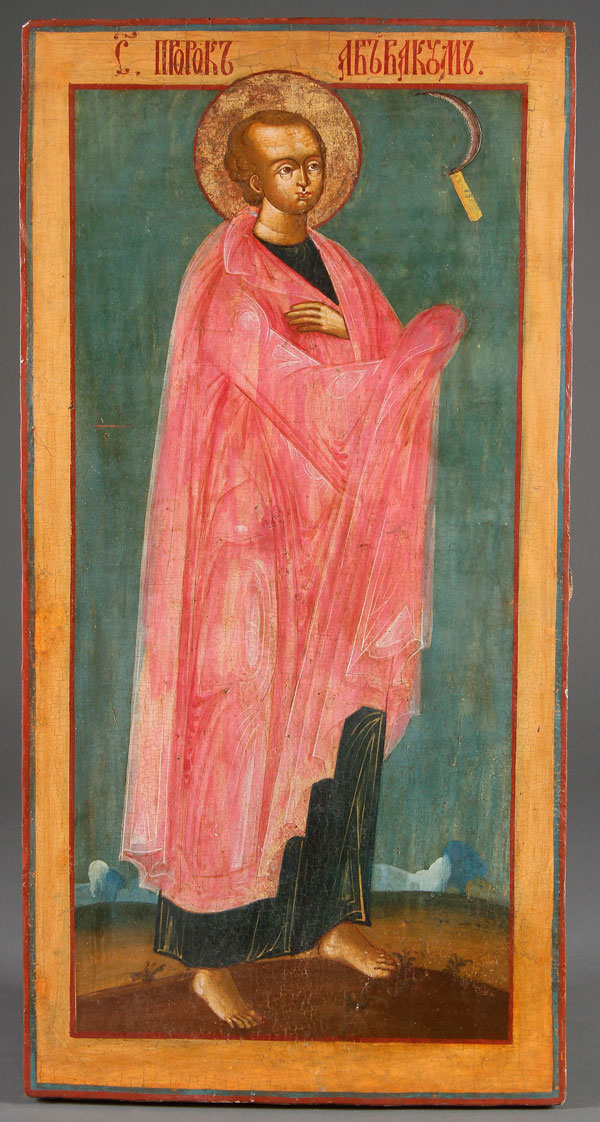 While the Old Church Slavonic inscription on the upper border of this icon clearly reads, The Holy Prophet Habbakuk, it would seem the iconographer of the offered lot has incorrectly ascribed (painted) the wrong symbol for the prophet Avvakum/Habbakuk, rather instead he has painted the symbol for the prophet Zachariah, called the “Sickle-Seer” based on the Septuagint version of Zachariah 5:1-3. "1 And I turned, and lifted up mine eyes, and looked and behold a flying sickle. 2 And he said to me, What seest thou? And I said, I see a flying sickle, of the length of twenty cubits, and of the breadth of ten cubits. 3 And he said to me, This is the curse that goes forth over the face of the whole earth: for every thief shall be punished with death on this side, and every false swearer shall be punished on that side."