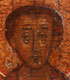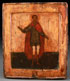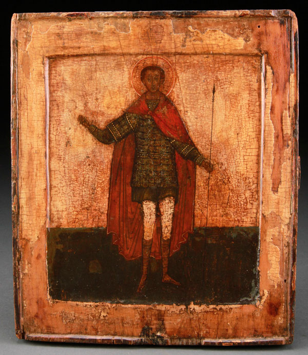 A RUSSIAN ICON OF A WARRIOR SAINT, STROGANOV SCHOOL STYLE, 17TH/18TH CENTURY. At center, a full length image of an armor clad soldier saint (probably Saint Dimitry) wearing red cape, holding a lance, and delivering a blessing with his right hand in the manner favored by the Old Believers. 10.5 inches x 9.1 inches (26.7 x 23 cm).