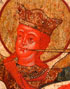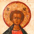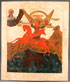 A LARGE RUSSIAN ICON OF THE ARCHANGEL MICHAEL, CIRCA 1800. In this popular type, based on the book of Revelations, Michael is depicted as the Chief Captain of the heavenly armies. He wears a crown and rides upon a red winged horse. A rainbow extends over his head, a long trumpet extends from his mouth, he holds a censor and in the same hand a lance plunges into Satan, who has fallen into the abyss depicted below. At upper left is Christ Emmanuel before the Hetimasia, the prepared altar which is also the symbolic throne of Christ. 29.75 inches x 25.5 inches (75.5 x 65 cm).