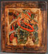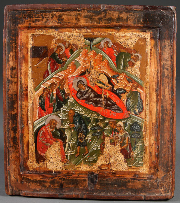 A RUSSIAN ICON OF THE NATIVITY OF CHRIST, 19TH CENTURY, IN THE HIGHLY STYLIZED REVIVALIST MANNER. Executed on a much earlier 16th century panel. 12.5 inches x 11.1 inches (31.8 x 28.2 cm).