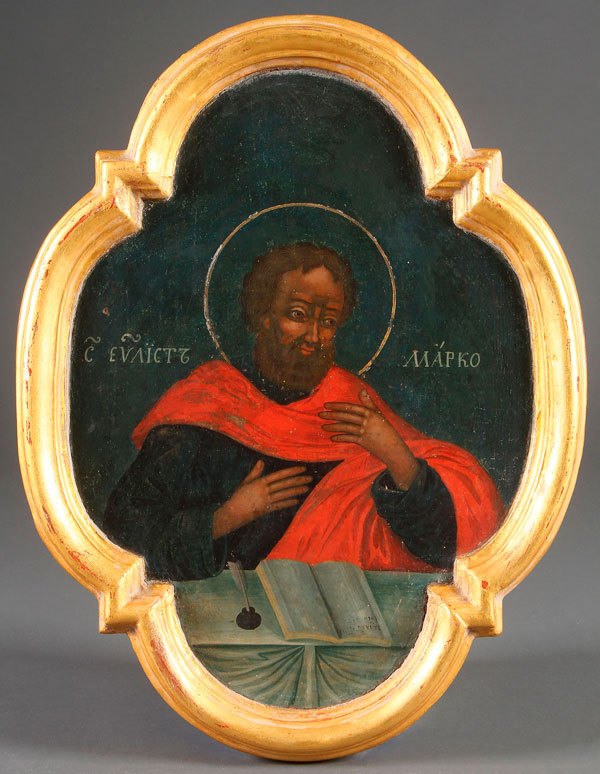 A RUSSIAN ICON OF THE EVANGELIST ST. MARK, 18TH CENTURY. Contained in an integral carved gilt frame. Most likely one of the four evangelists mounted on the royal doors of an Iconostasis. 23.25 inches x 17.75 inches (59 x 45 cm).
