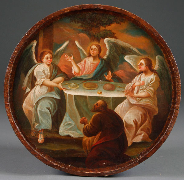 A RUSSIAN ICON OF THE OLD TESTAMENT TRINITY, 18TH CENTURY. In the Western style, probably once installed above the royal doors of a rural chapel. Diameter 14.8 inches (37.7 cm).