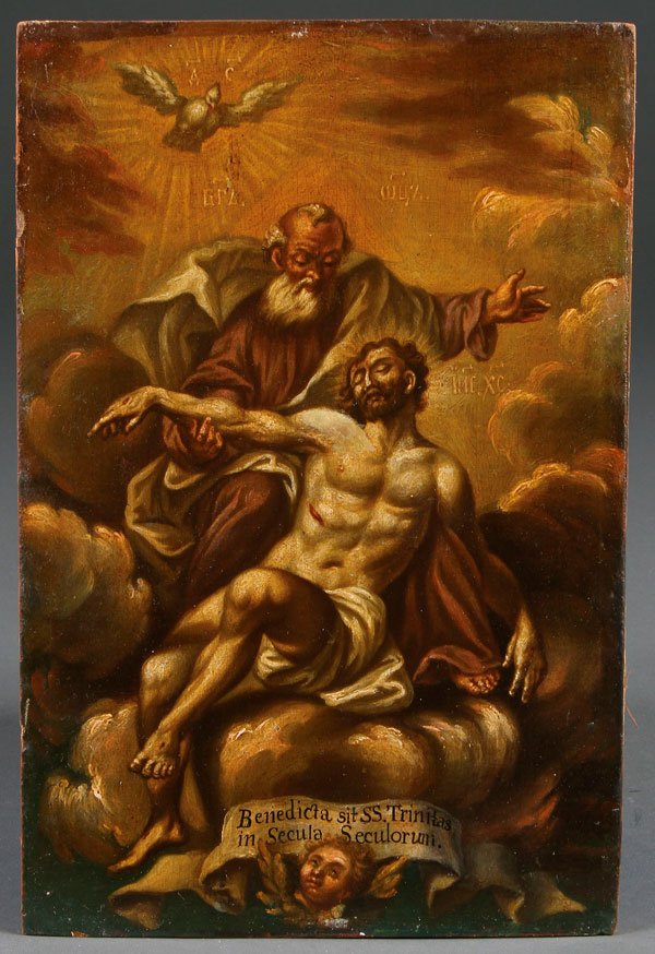 A UNIQUE ITALO-RUSSIAN ICON OF THE NEW TESTAMENT TRINITY, 18TH CENTURY. Depicting God the Father embracing his crucified son and above a dove representing the Holy Spirit. All the figures identified by the abbreviated Old Church Slavonic inscriptions and inscribed in Latin on a scroll held by a winged putti "Blessed be the Holy Trinity now and forever". 11.75 inches x 7.75 inches (30 x 19.8 cm), contained in a later gilt frame.