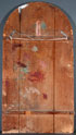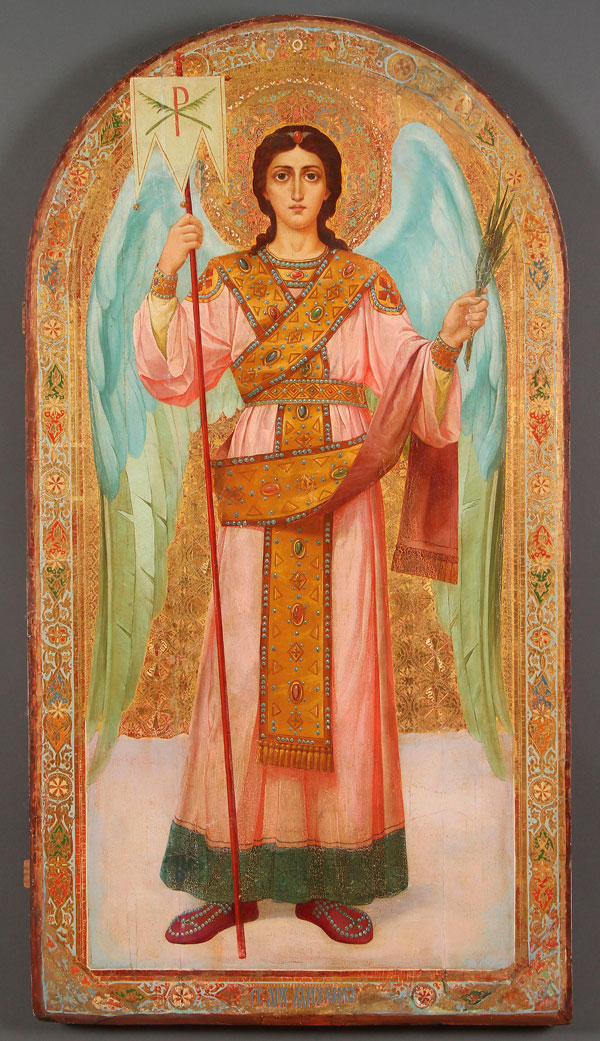 A LARGE AND IMPRESSIVE RUSSIAN ICON OF THE ARCHANGEL MICHAEL, ABRAMTSEVO SCHOOL, CIRCA 1890. Executed on a large arched wood panel, a full length image of the Archangel Michael holding a Chi-Rho banner and palm fronds, and wearing a gem encrusted stole and cuffs. The background and borders ornately incised to simulate cloisonné enameling. 52 inches x 28 inches (132 x 71 cm).