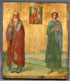 AN INTERESTING RUSSIAN ICON OF THE MARTYR SAINTS KHARLAMPIY AND VINOPHANTI. Between them an icon of The Mother of God Surety of Sinners. 17.6 inches x 15.25 inches (44.8 x 38.4 cm).