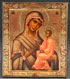 A RUSSIAN ICON OF THE TIKHVIN MOTHER OF GOD, CIRCA 1890. A finely painted example of this patroness of families, Christ delivers a blessing as his mother directs the viewers to her son, the source of salvation. The gilt background decoratively incised and the boarders intricately painted to simulate cloisonné enameling. The lower margin with rectangular cartouche inscribed with the title for this icon. 14 x 12.25 inches (35.7 x 31 cm).