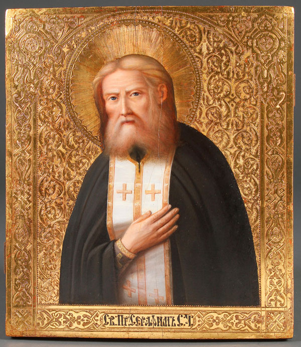 A FINE BLESSED RUSSIAN ICON OF SAINT SERAPHIM OF SAROV, CIRCA 1900. In this waist up depiction Seraphim wears the Monastic Skema and holds his hand to his heart. The gilt background and borders intricately incised with scrolling foliage and strapwork. The lower border with rectangular cartouche abbreviated old Slavonic inscription identifying the subject as "The Holy Venerable Seraphim of Sarov Wonderworker". Verso with lengthy period inscription stating the icon was blessed over the remains of Saint Seraphim. 14 inches x 12.25 inches (36 x 31.5 cm).