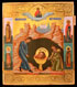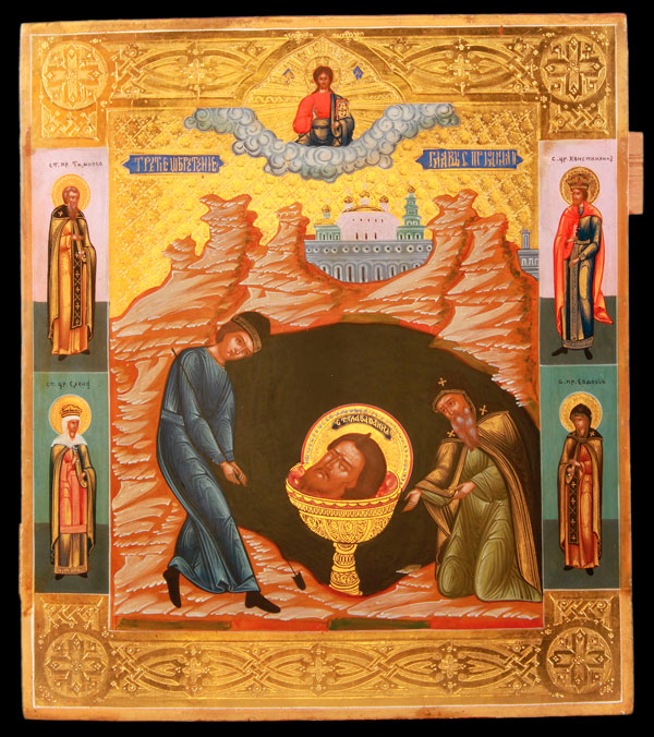 A FINE RUSSIAN ICON OF THE THIRD FINDING OF THE HEAD OF JOHN THE FORERUNNER, CIRCA 1890, PROBABLY PALEKH. At center, a monk and his assistant uncovering the head of John the Forerunner within a cave, and the city walls of Emesia are shown in the distance. At top center, Christ delivers a blessing from atop characteristic Palekh style clouds, and the gilt background and borders ornately incised with cross forms and strapwork. The borders displaying Saints Timothy, Evdokia, and Saints Constantine and Helen. 13.75 inches x 12 inches (35 x 30.7 cm).