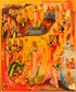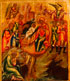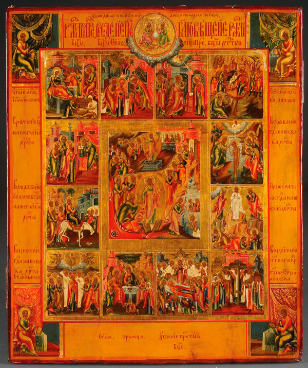 A VERY FINE RUSSIAN ICON OF THE RESURRECTION AND DESCENT WITH FEASTS, MSTERA, 1880. At the center, Christ descends into Hades to release the righteous men and women of the Old Testament from bondage and above Christ stands triumphant above his empty tomb and burial shroud. The central image surrounded by 12 major Church feast days each identified with corresponding inscriptions. At top center the New Testament trinity within a roundel atop characteristically styled Mstera clouds and the corners with the Four Evangelists. Finely painted in miniature and in a good state of original preservation. 17.5 inches x 14.5 inches (44.5 x 37 cm).