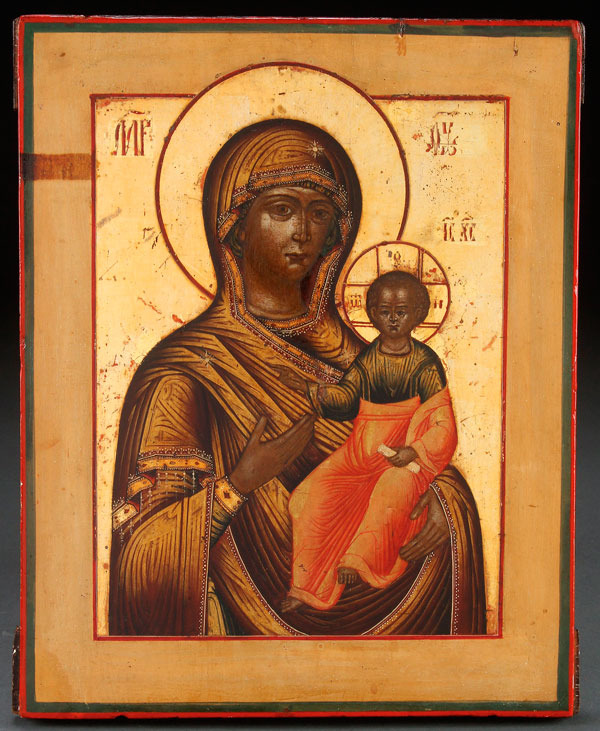 A FINE RUSSIAN ICON OF THE SMOLENSK MOTHER OF GOD, 18TH CENTURY. Finely painted on a gilded ground, following the traditional "Old Style" and with extensive use of chrysography. In a very fine state of preservation. 12.75 inches x 10 inches (32.3 x 25.6 cm).