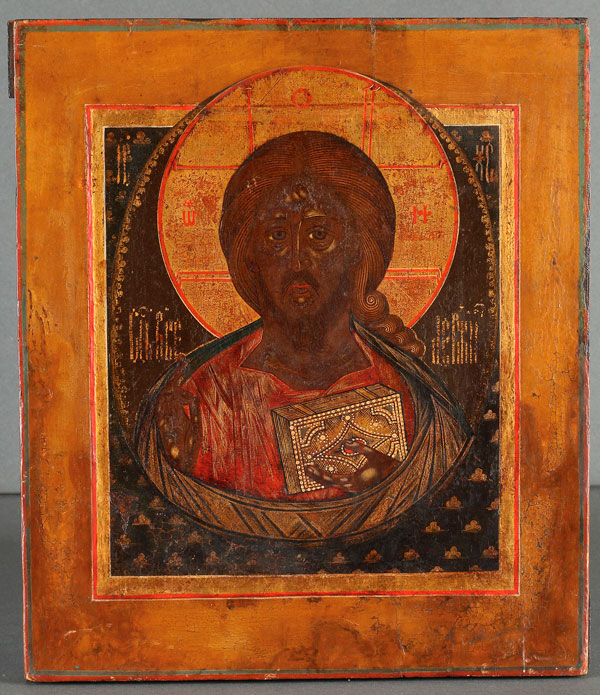 AN INTERESTING RUSSIAN ICON OF CHRIST AS THE LORD ALMIGHTY, 18TH CENTURY. Christ enclosed within an oval aureola lined with gilt clouds. 14 inches x 12 inches (35.5 x 30.5 cm).